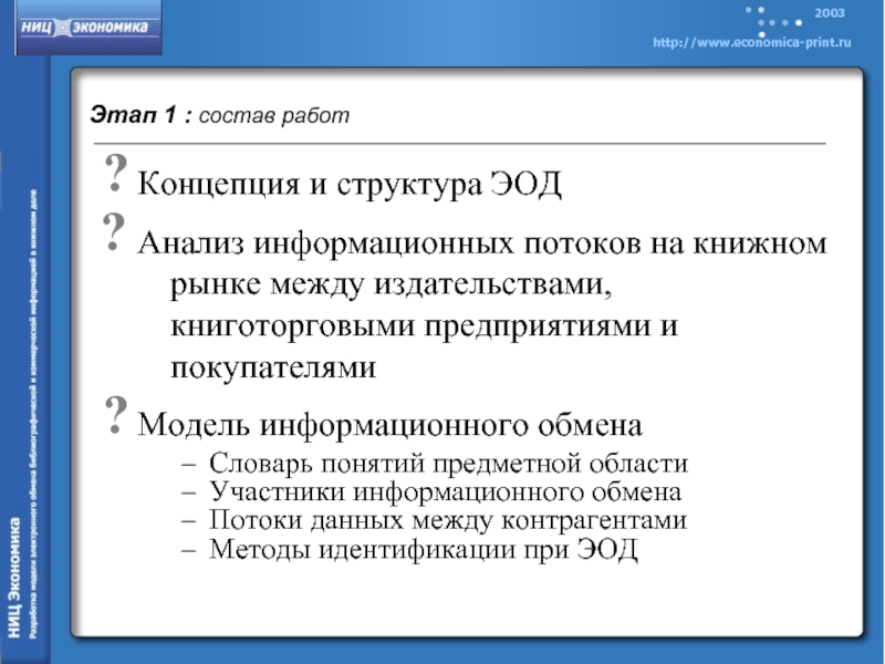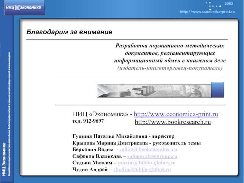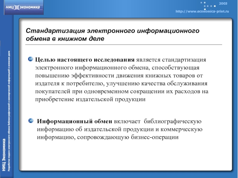 Целью настоящего исследования является стандартизация электронного информационного обмена, способствующая повышению эффективности движения книжных товаров от издателя к потребителю, улучшению качества обслуживания покупателей при одновременном сокращении их расходов на приобретение издательской продукции