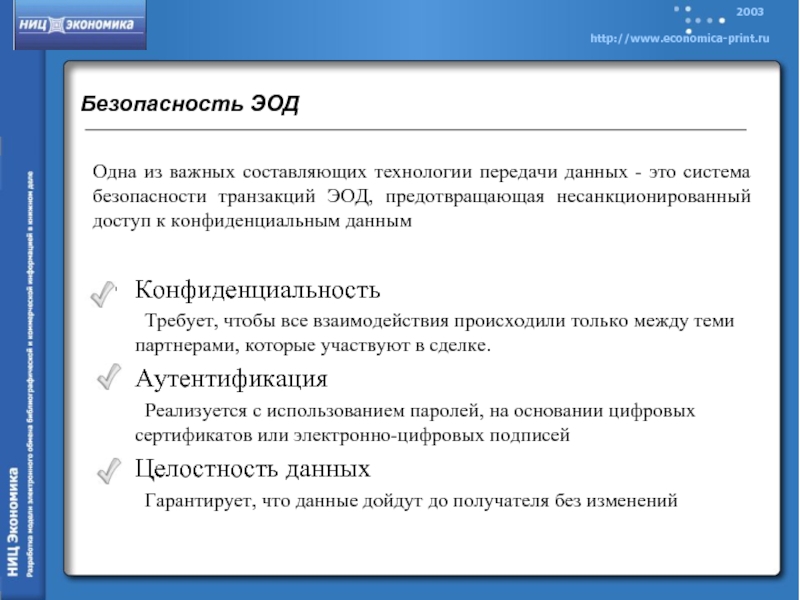 Одна из важных составляющих технологии передачи данных - это система безопасности транзакций ЭОД, предотвращающая несанкционированный доступ к конфиденциальным данным