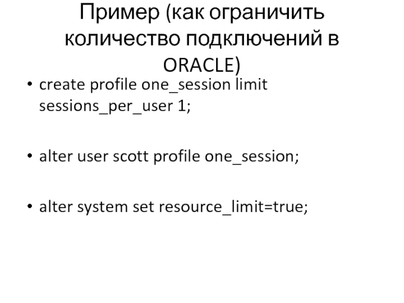 Слайд 20Пример (как ограничить количество подключений в ORACLE)