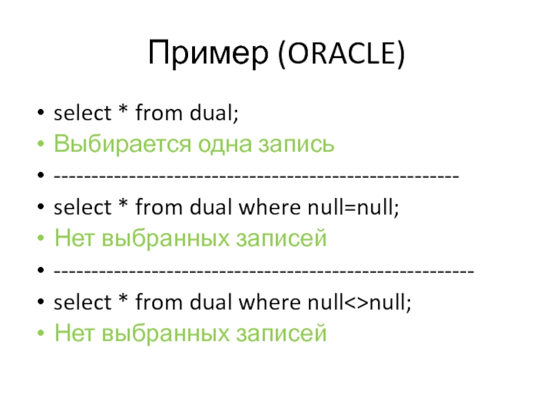 SQL Server допускают сравнение (=) со значением NULL, а ORACLE – нет.