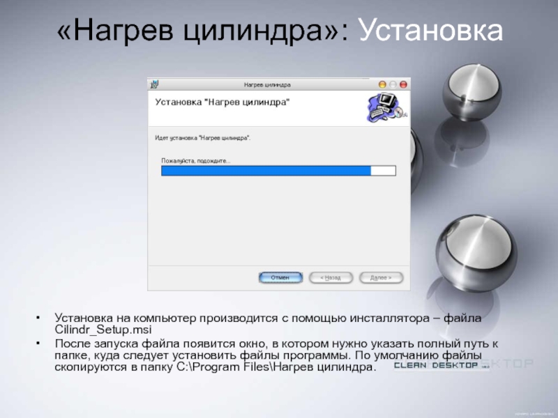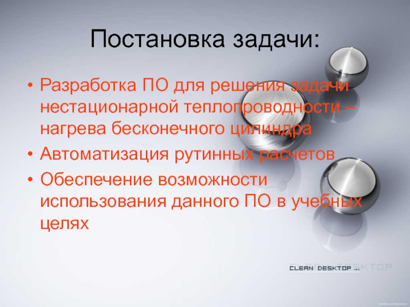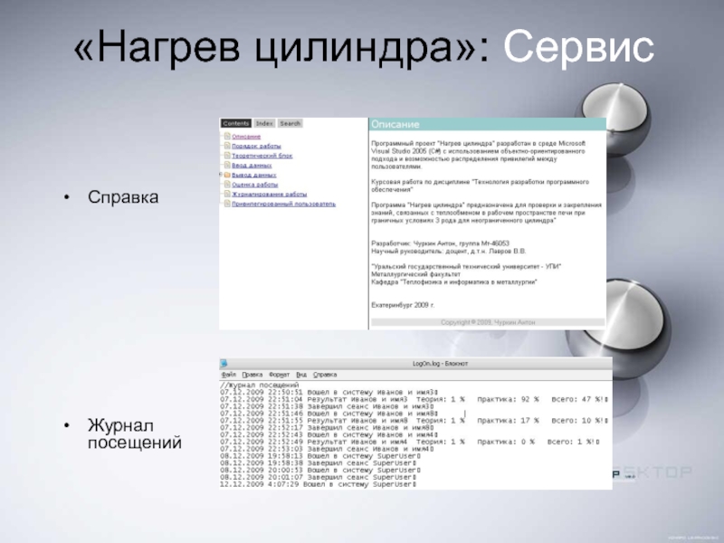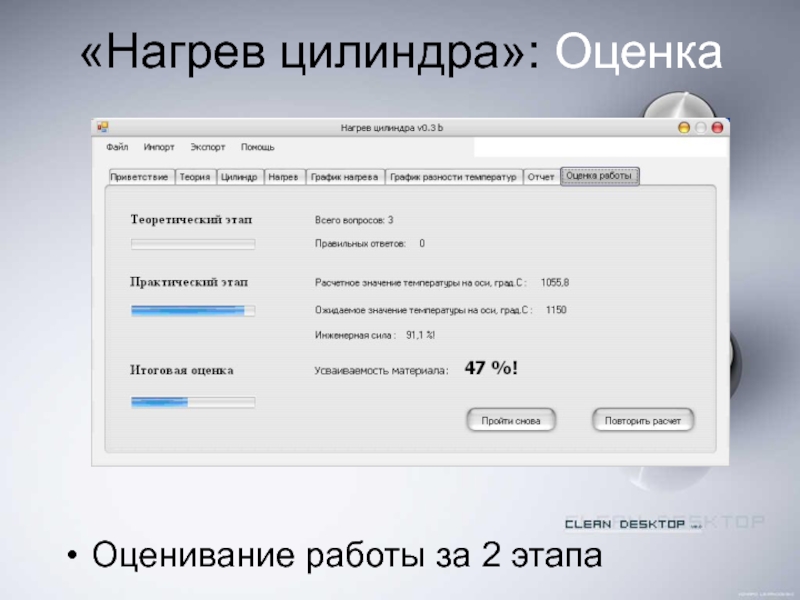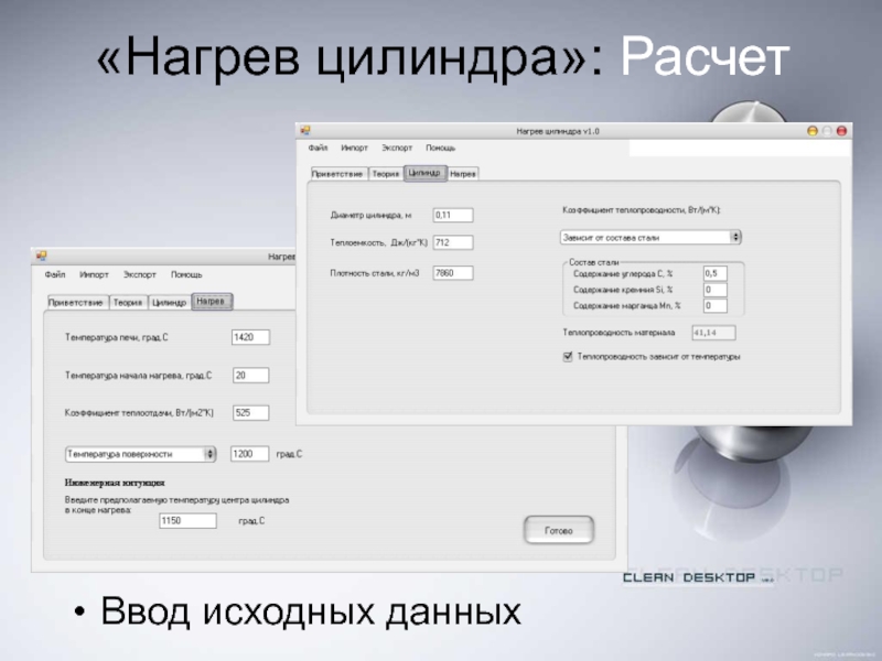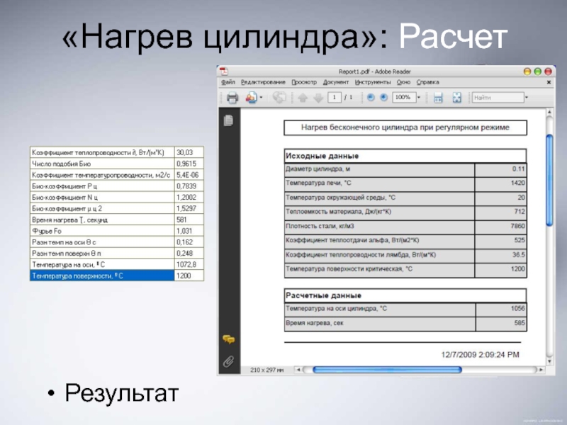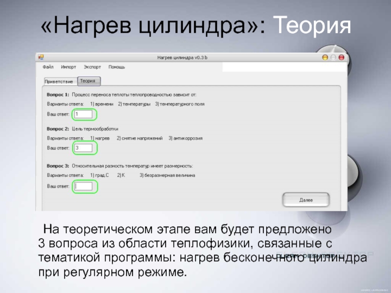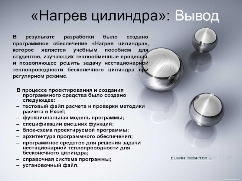 В результате разработки было создано программное обеспечение «Нагрев цилиндра», которое является учебным пособием для студентов, изучающих теплообменные процессы, и позволяющее решить задачу нестационарной теплопроводности бесконечного цилиндра при регулярном режиме.