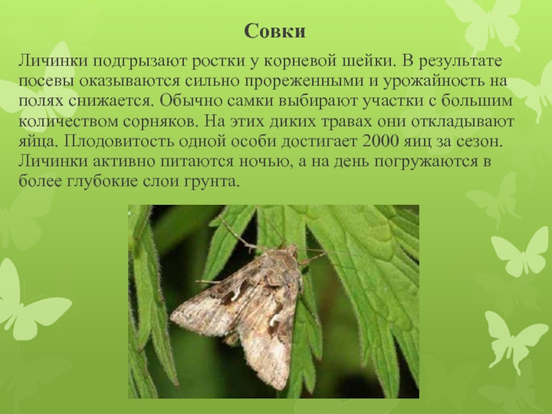 сильно прореженными и урожайность на полях снижается. Обычно самки выбирают участки с большим количеством сорняков. На этих диких травах они откладывают яйца. Плодовитость одной особи достигает 2000 яиц за сезон. Личинки активно питаются ночью, а на день погружаются в более глубокие слои грунта.