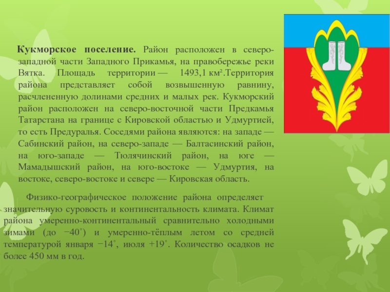 Слайд 3 Кукморское поселение. Район расположен в северо-западной части Западного Прикамья, на