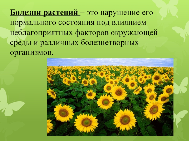 Слайд 4Болезни растений – это нарушение его нормального состояния под влиянием неблагоприятных
