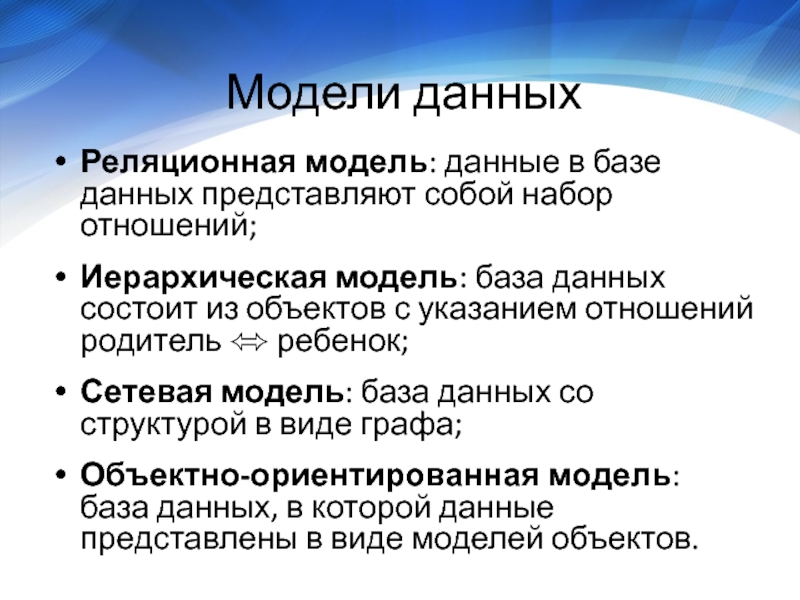 Объектно-ориентированная модель: база данных, в которой данные представлены в виде моделей объектов.