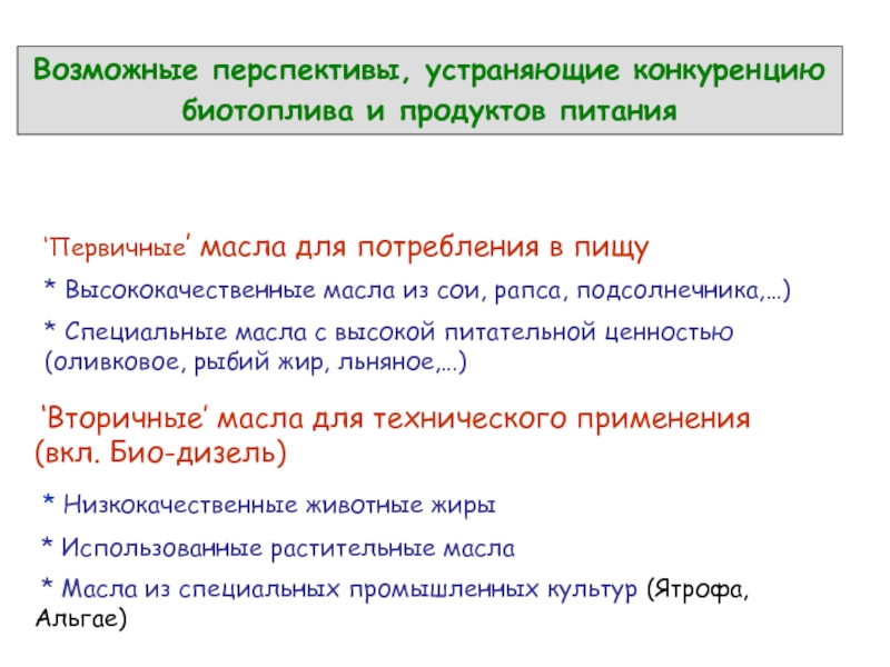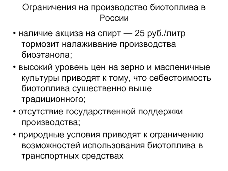 • высокий уровень цен на зерно и масленичные культуры приводят к тому, что себестоимость биотоплива существенно выше традиционного;