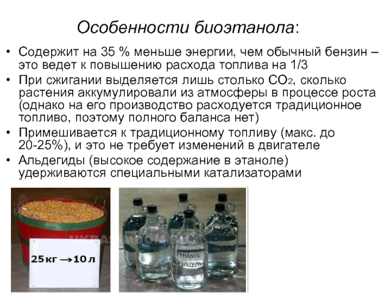 Содержит на 35 % меньше энергии, чем обычный бензин