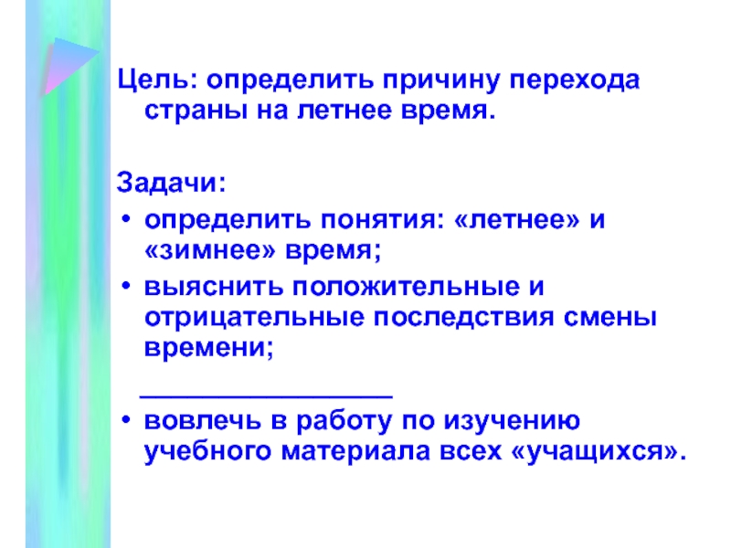 Слайд 8Цель: определить причину перехода страны на летнее время.
