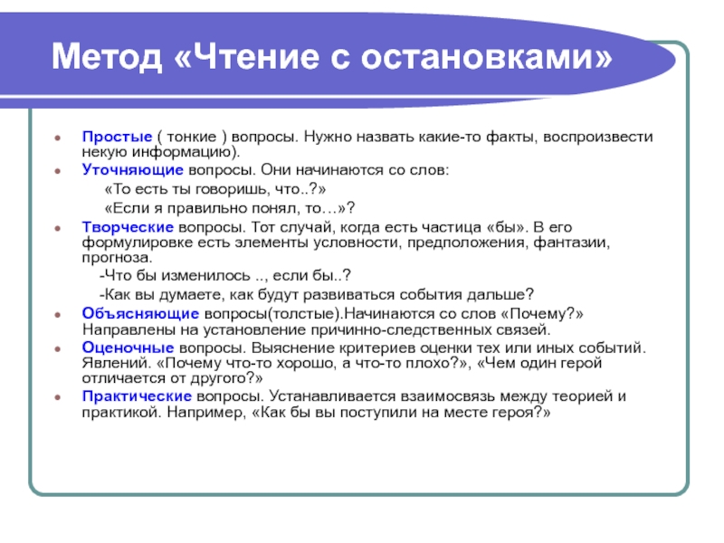 Объясняющие вопросы(толстые).Начинаются со слов «Почему?» Направлены на установление причинно-следственных связей.
