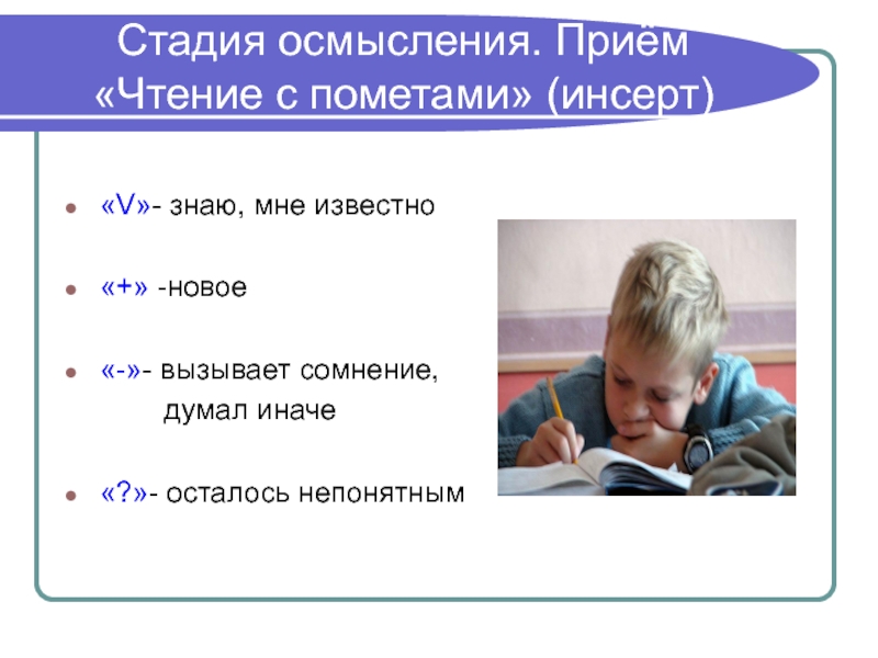 Слайд 13Стадия осмысления. Приём «Чтение с пометами» (инсерт)