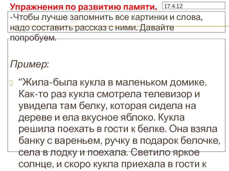 “Жила-была кукла в маленьком домике. Как-то раз кукла смотрела телевизор и увидела там белку, которая сидела на дереве и ела вкусное яблоко. Кукла решила поехать в гости к белке. Она взяла банку с вареньем, ручку в подарок белочке, села в лодку и поехала. Светило яркое солнце, и скоро кукла приехала в гости к белке.