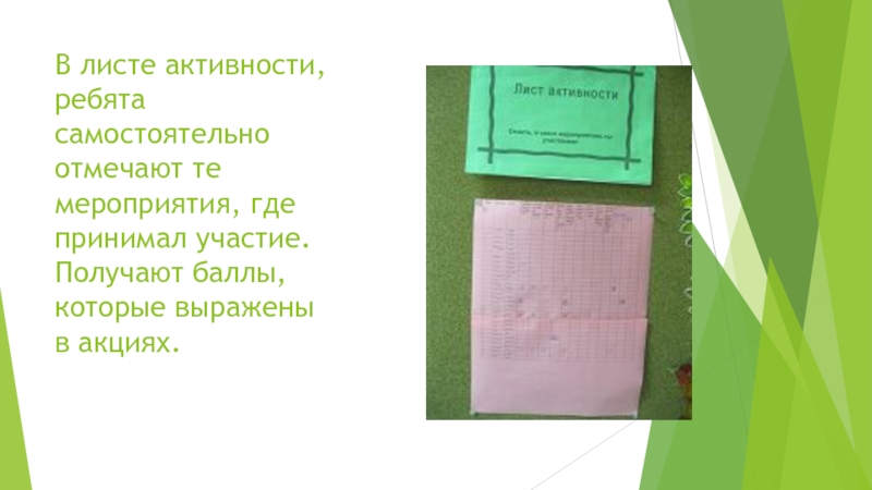 Слайд 8В листе активности, ребята самостоятельно отмечают те мероприятия, где принимал участие.