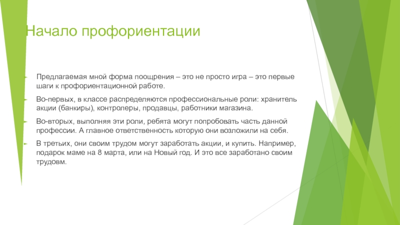 Во-первых, в классе распределяются профессиональные роли: хранитель акции (банкиры), контролеры, продавцы, работники магазина.