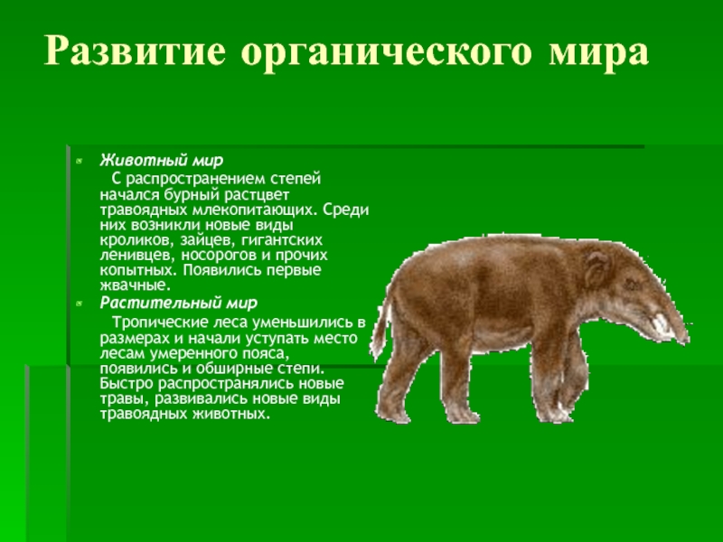 начался бурный растцвет травоядных млекопитающих. Среди них возникли новые виды кроликов, зайцев, гигантских ленивцев, носорогов и прочих копытных. Появились первые жвачные.