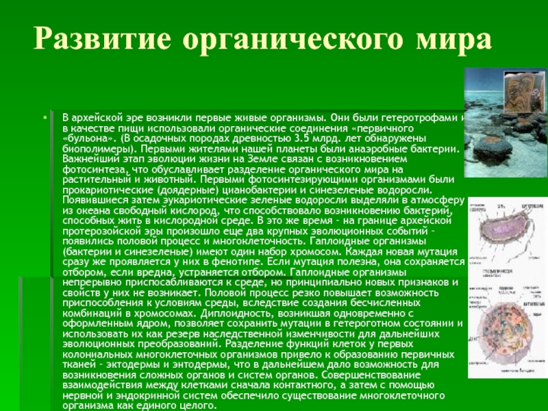 были гетеротрофами и в качестве пищи использовали органические соединения «первичного «бульона». (В осадочных породах древностью 3.5 млрд. лет обнаружены биополимеры). Первыми жителями нашей планеты были анаэробные бактерии. Важнейший этап эволюции жизни на Земле связан с возникновением фотосинтеза, что обуславливает разделение органического мира на растительный и животный. Первыми фотосинтезирующими организмами были прокариотические (доядерные) цианобактерии и синезеленые водоросли. Появившиеся затем эукариотические зеленые водоросли выделяли в атмосферу из океана свободный кислород, что способствовало возникновению бактерий, способных жить в кислородной среде. В это же время – на границе архейской протерозойской эры произошло еще два крупных эволюционных событий – появились половой процесс и многоклеточность. Гаплоидные организмы (бактерии и синезеленые) имеют один набор хромосом. Каждая новая мутация сразу же проявляется у них в фенотипе. Если мутация полезна, она сохраняется отбором, если вредна, устраняется отбором. Гаплоидные организмы непрерывно приспосабливаются к среде, но принципиально новых признаков и свойств у них не возникает. Половой процесс резко повышает возможность приспособления к условиям среды, вследствие создания бесчисленных комбинаций в хромосомах. Диплоидность, возникшая одновременно с оформленным ядром, позволяет сохранить мутации в гетероготном состоянии и использовать их как резерв наследственной изменчивости для дальнейших эволюционных преобразований. Разделение функций клеток у первых колониальных многоклеточных организмов привело к образованию первичных тканей – эктодермы и энтодермы, что в дальнейшем дало возможность для возникновения сложных органов и систем органов. Совершенствование взаимодействия между клетками сначала контактного, а затем с помощью нервной и эндокринной систем обеспечило существование многоклеточного организма как единого целого.