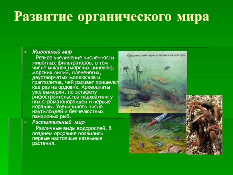 числе мшанок (морских циновок), морских лилий, плеченогих, двустворчатых моллюсков и граптолитов, чей расцвет пришелся как раз на ордовик. Археоциаты уже вымерли, но эстафету рифостроительства подхватили у них строматопороидеи и первые кораллы. Увеличилось число наутилоидей и бесчелюстных панцирных рыб.