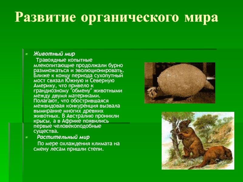 продолжали бурно размножаться и эволюционировать. Ближе к концу периода сухопутный мост связал Южную и Северную Америку, что привело к грандиозному "обмену" животными между двумя материками. Полагают, что обострившаяся межвидовая конкуренция вызвала вымирание многих древних животных. В Австралию проникли крысы, а в Африке появились первые человекоподобные существа.