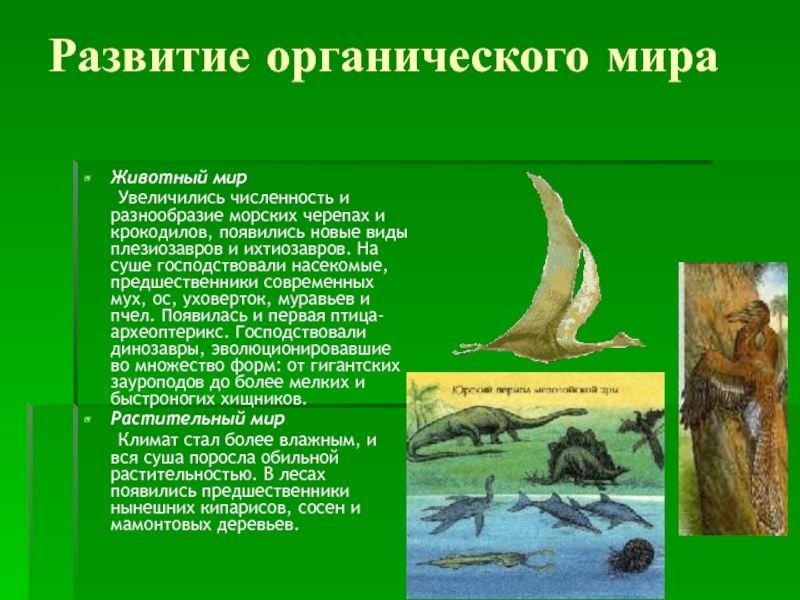 морских черепах и крокодилов, появились новые виды плезиозавров и ихтиозавров. На суше господствовали насекомые, предшественники современных мух, ос, уховерток, муравьев и пчел. Появилась и первая птица-археоптерикс. Господствовали динозавры, эволюционировавшие во множество форм: от гигантских зауроподов до более мелких и быстроногих хищников.