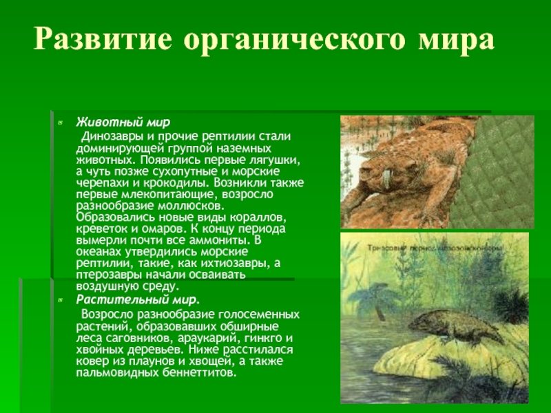 группой наземных животных. Появились первые лягушки, а чуть позже сухопутные и морские черепахи и крокодилы. Возникли также первые млекопитающие, возросло разнообразие моллюсков. Образовались новые виды кораллов, креветок и омаров. К концу периода вымерли почти все аммониты. В океанах утвердились морские рептилии, такие, как ихтиозавры, а птерозавры начали осваивать воздушную среду.