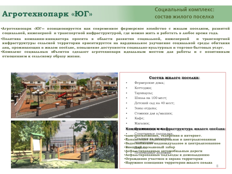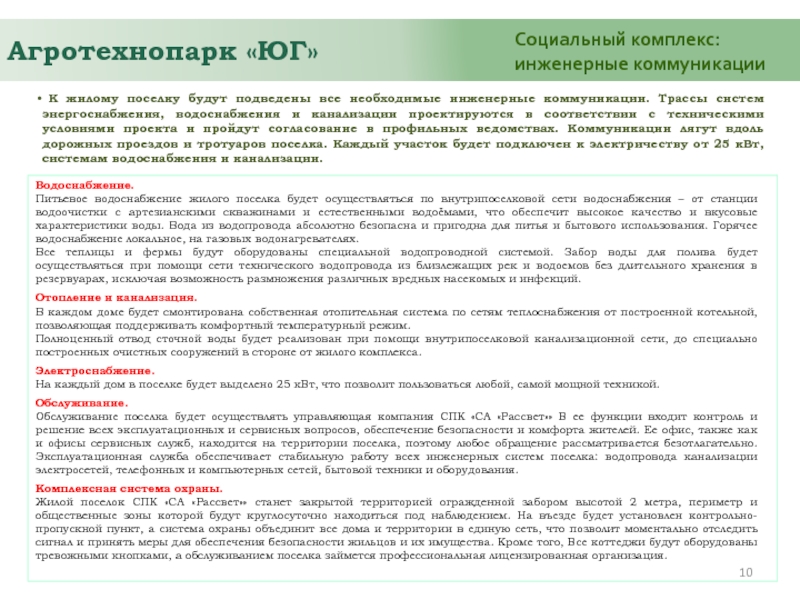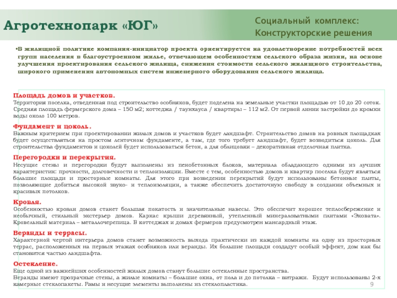 В жилищной политике компания-инициатор проекта ориентируется на удовлетворение потребностей всех групп населения в благоустроенном жилье, отвечающем особенностям сельского образа жизни, на основе улучшения проектирования сельского жилища, снижения стоимости сельского жилищного строительства, широкого применения автономных систем инженерного оборудования сельского жилища.