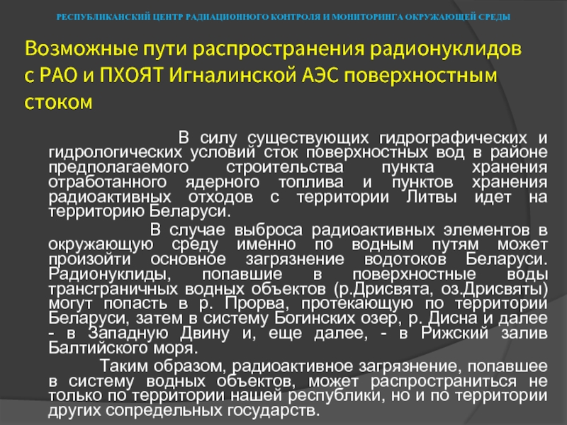 Таким образом, радиоактивное загрязнение, попавшее в систему водных объектов, может распространиться не только по территории нашей республики, но и по территории других сопредельных государств.