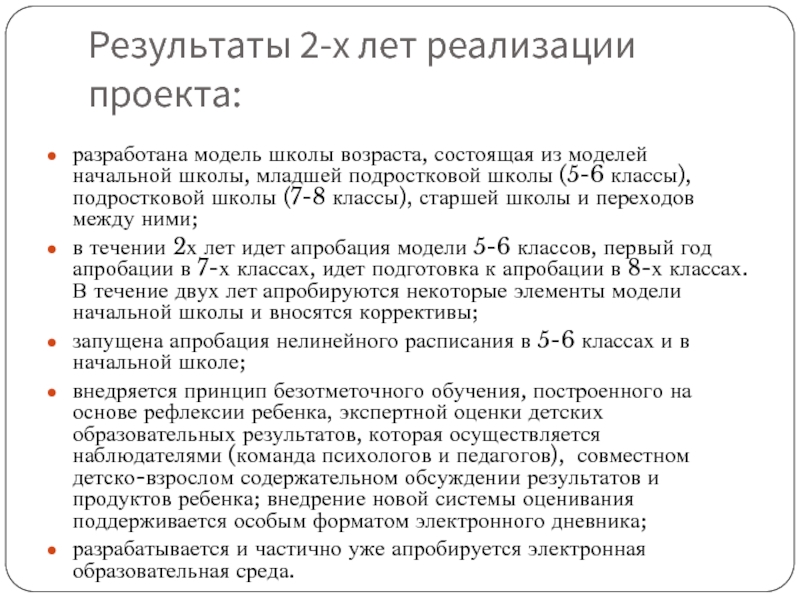 в течении 2х лет идет апробация модели 5-6 классов, первый год апробации в 7-х классах, идет подготовка к апробации в 8-х классах. В течение двух лет апробируются некоторые элементы модели начальной школы и вносятся коррективы;