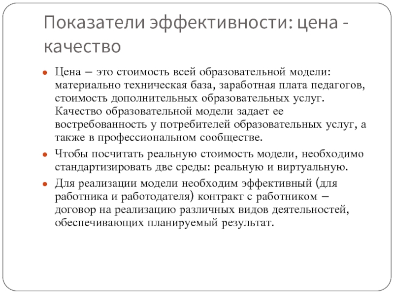 материально техническая база, заработная плата педагогов, стоимость дополнительных образовательных услуг. Качество образовательной модели задает ее востребованность у потребителей образовательных услуг, а также в профессиональном сообществе.