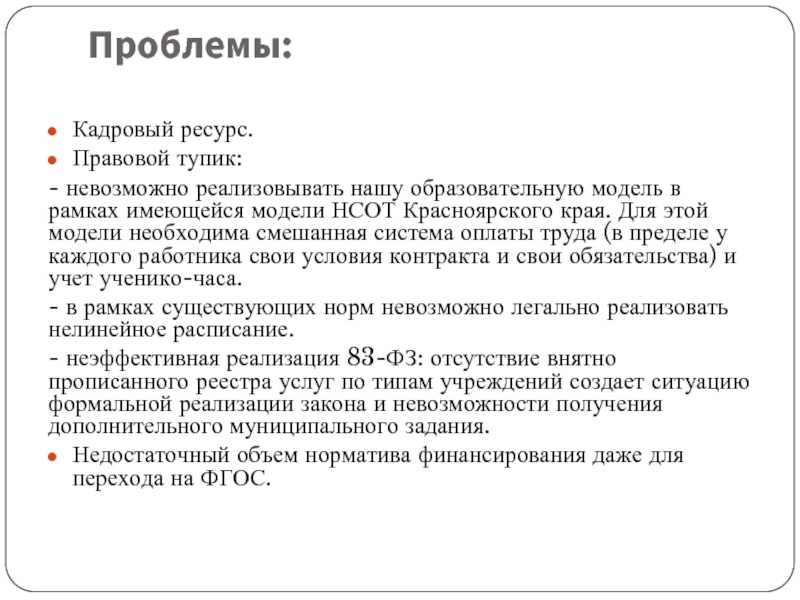 - неэффективная реализация 83-ФЗ: отсутствие внятно прописанного реестра услуг по типам учреждений создает ситуацию формальной реализации закона и невозможности получения дополнительного муниципального задания.