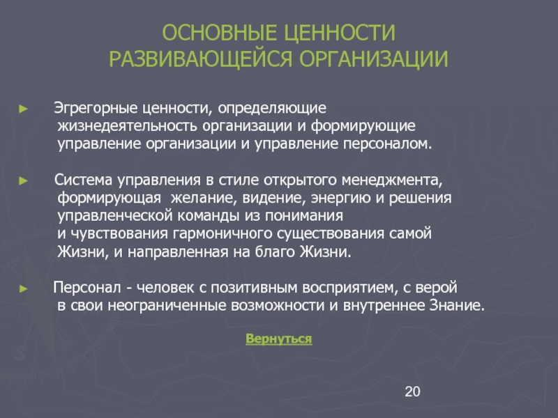 организации – эгрегорные ценности - принципы, правила и стереотипы работы организации: