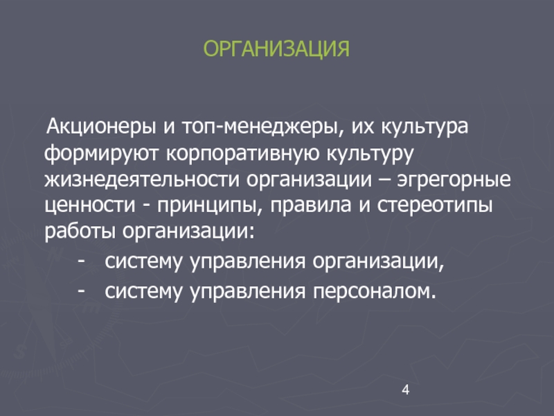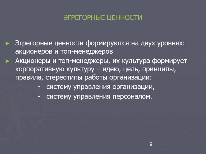 Эгрегорные ценности формируются на двух уровнях: акционеров и топ-менеджеров