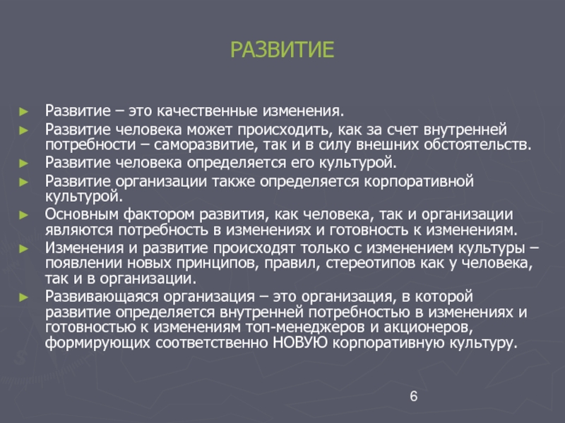 Изменения и развитие происходят только с изменением культуры – появлении новых принципов, правил, стереотипов как у человека, так и в организации.