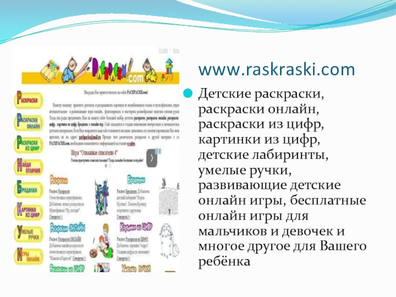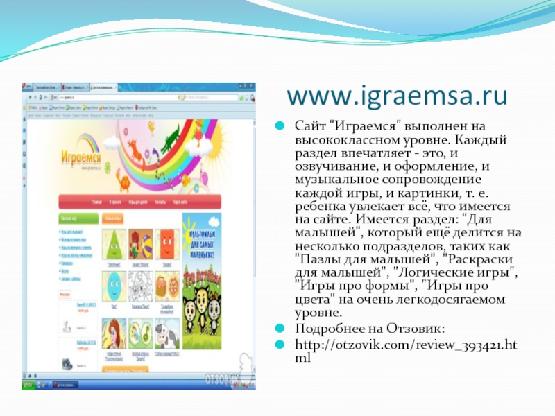 и озвучивание, и оформление, и музыкальное сопровождение каждой игры, и картинки, т. е. ребенка увлекает всё, что имеется на сайте. Имеется раздел: "Для малышей", который ещё делится на несколько подразделов, таких как "Пазлы для малышей", "Раскраски для малышей", "Логические игры", "Игры про формы", "Игры про цвета" на очень легкодосягаемом уровне.