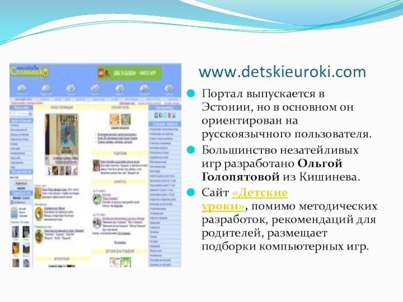 Сайт «Детские уроки», помимо методических разработок, рекомендаций для родителей, размещает подборки компьютерных игр.