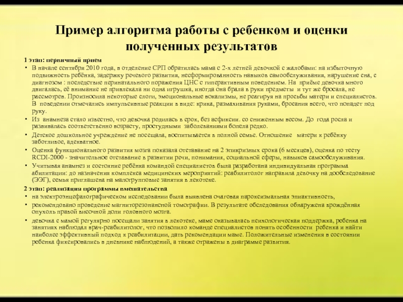 В начале сентября 2010 года, в отделение СРП обратилась мама с 2-х летней девочкой с жалобами: на избыточную подвижность ребёнка, задержку речевого развития, несформированность навыков самообслуживания, нарушение сна, с диагнозом : последствие перинатального поражения ЦНС с гиперактивным поведением. На приёме девочка много двигалась, её внимание не привлекала ни одна игрушка, иногда она брала в руки предметы и тут же бросала, не рассмотрев. Произносила некоторые слоги, эмоциональные вокализмы, не реагируя на просьбы матери и специалистов. В поведении отмечались импульсивные реакции в виде: крика, размахивания руками, бросания всего, что попадет под руку.