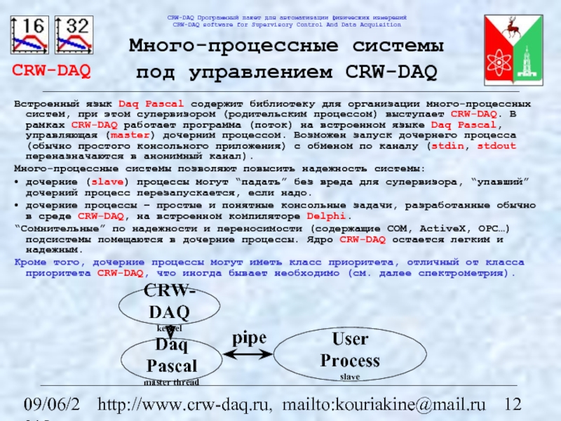 для организации много-процессных систем, при этом супервизором (родительским процессом) выступает CRW-DAQ. В рамках CRW-DAQ работает программа (поток) на встроенном языке Daq Pascal, управляющая (master) дочерним процессом. Возможен запуск дочернего процесса (обычно простого консольного приложения) с обменом по каналу (stdin, stdout переназначаются в анонимный канал).