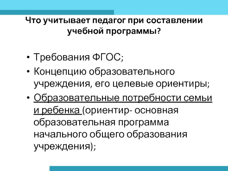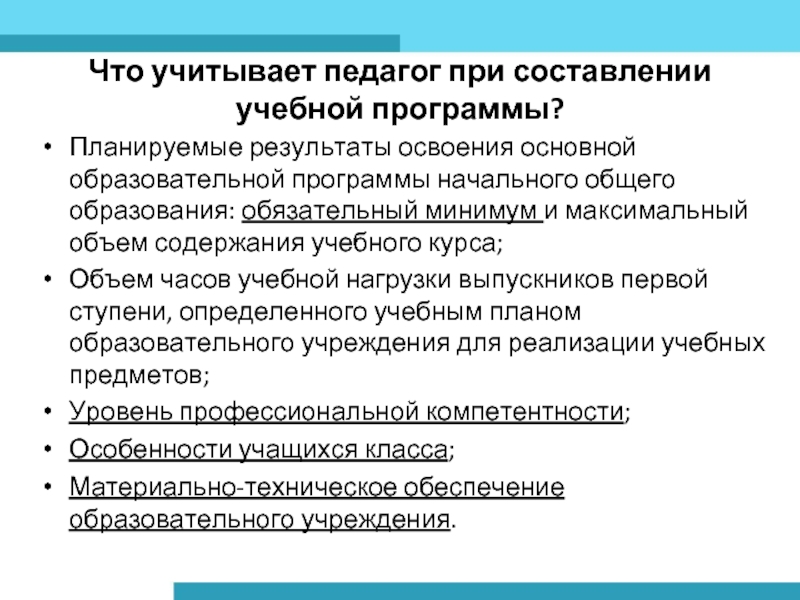 Слайд 28Что учитывает педагог при составлении учебной программы?