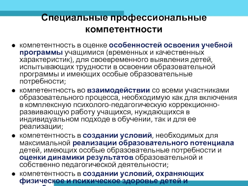 компетентность в создании условий, необходимых для максимальной реализации образовательного потенциала детей, имеющих особые образовательные потребности и оценки динамики результатов образовательной и собственно педагогической деятельности;