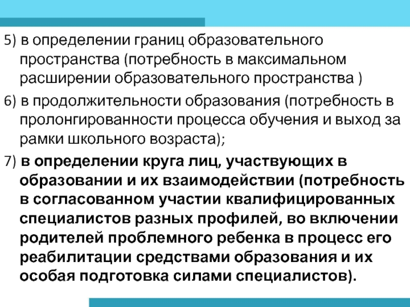 7) в определении круга лиц, участвующих в образовании и их взаимодействии (потребность в согласованном участии квалифицированных специалистов разных профилей, во включении родителей проблемного ребенка в процесс его реабилитации средствами образования и их особая подготовка силами специалистов).