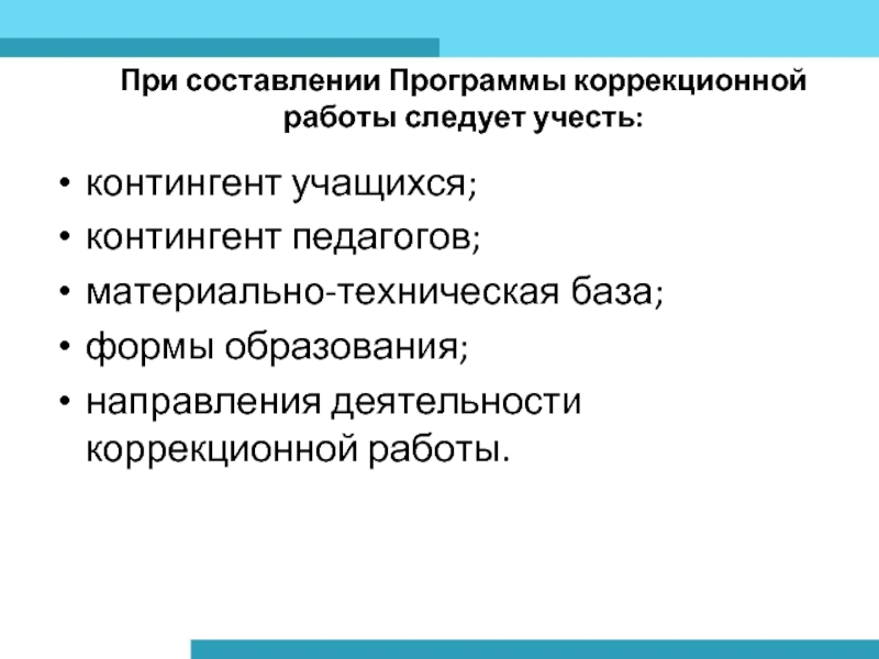 Слайд 17При составлении Программы коррекционной работы следует учесть: