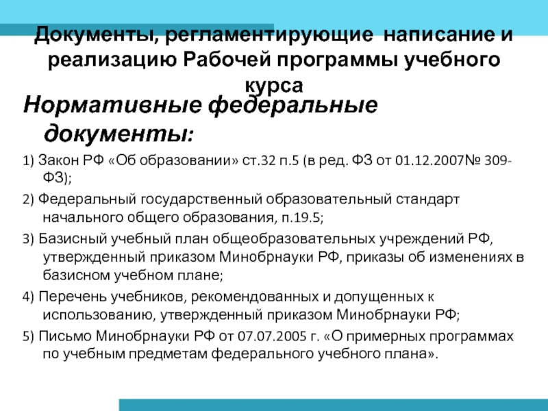 Слайд 27Документы, регламентирующие написание и реализацию Рабочей программы учебного курса