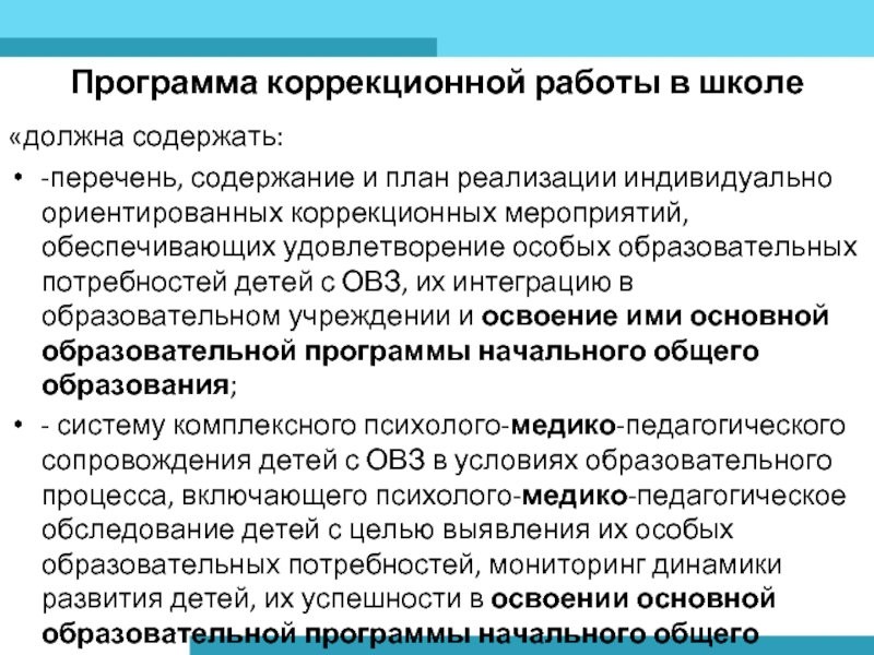 ориентированных коррекционных мероприятий, обеспечивающих удовлетворение особых образовательных потребностей детей с ОВЗ, их интеграцию в образовательном учреждении и освоение ими основной образовательной программы начального общего образования;