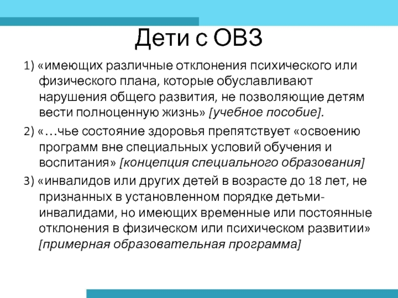 3) «инвалидов или других детей в возрасте до 18 лет, не признанных в установленном порядке детьми-инвалидами, но имеющих временные или постоянные отклонения в физическом или психическом развитии» [примерная образовательная программа]