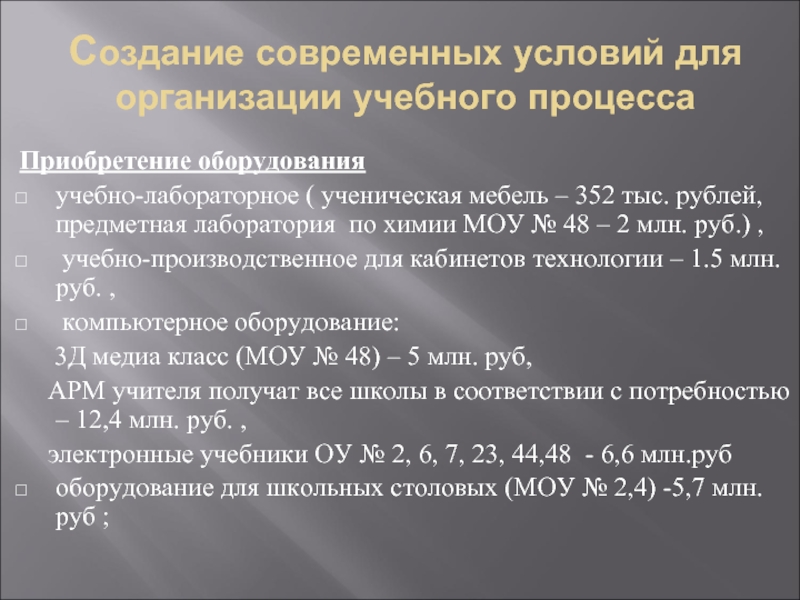 – 352 тыс. рублей, предметная лаборатория по химии МОУ № 48 – 2 млн. руб.) ,