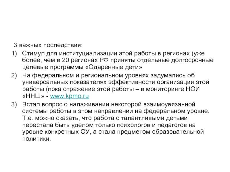 Встал вопрос о налаживании некоторой взаимоувязанной системы работы в этом направлении на федеральном уровне. Т.е. можно сказать, что работа с талантливыми детьми перестала быть уделом только психологов и педагогов на уровне конкретных ОУ, а стала предметом образовательной политики.