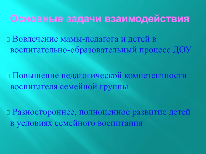 Участие в работе семейной группы всего педагогического коллектива ДОУ (воспитателей, старшего воспитателя, психолога, логопеда и других специалистов), четкая координации этой работы.