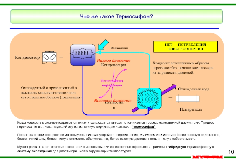 Mycom развил патентованные технологии в использовании естественных эффектов и применил гибридную термосифонную систему охлаждения для работы при низких окружающих температурах.