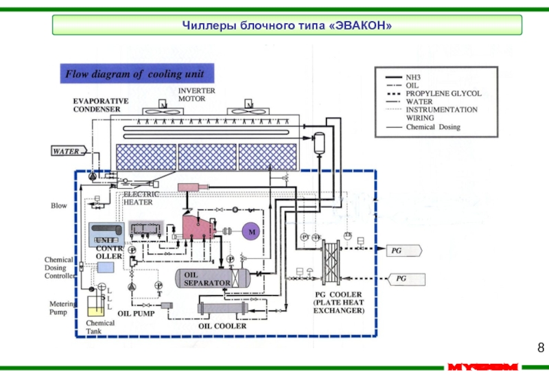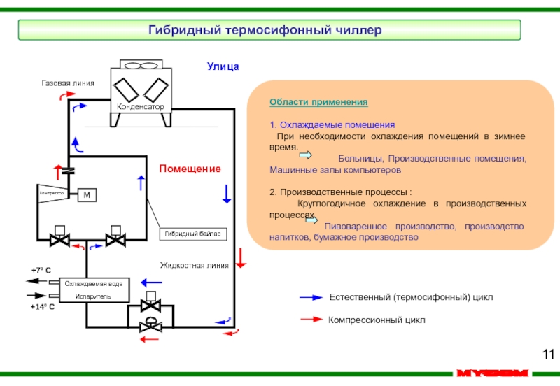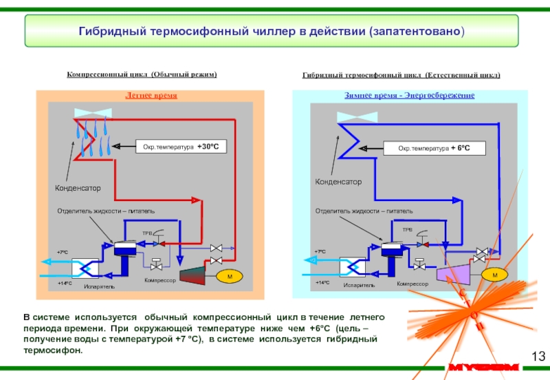 В системе используется обычный компрессионный цикл в течение летнего периода времени. При окружающей температуре ниже чем +6ºC (цель – получение воды с температурой +7 ºC), в системе используется гибридный термосифон.
