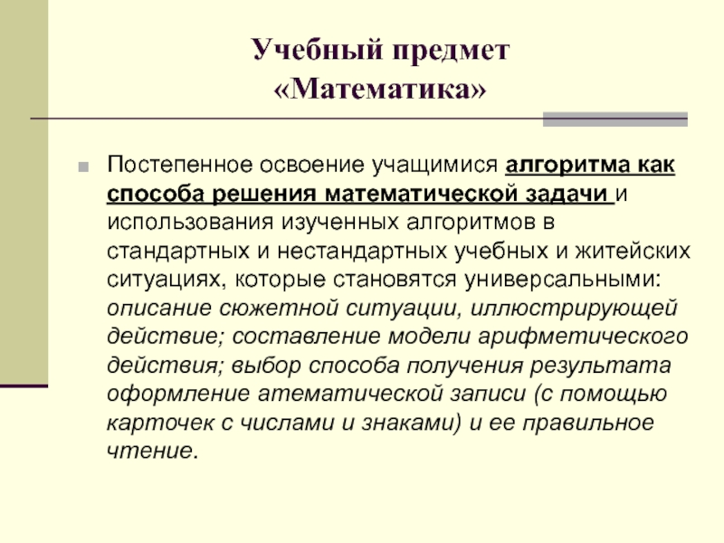 и использования изученных алгоритмов в стандартных и нестандартных учебных и житейских ситуациях, которые становятся универсальными:  описание сюжетной ситуации, иллюстрирующей действие; составление модели арифметического действия; выбор способа получения результата оформление атематической записи (с помощью карточек с числами и знаками) и ее правильное чтение.