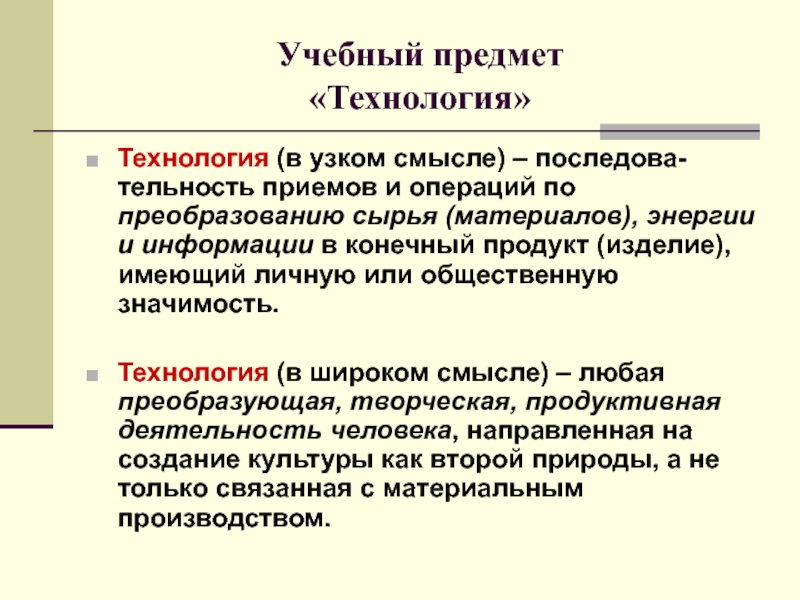 Технология (в широком смысле) – любая преобразующая, творческая, продуктивная деятельность человека, направленная на создание культуры как второй природы, а не только связанная с материальным производством.