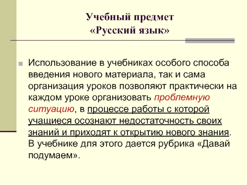 так и сама организация уроков позволяют практически на каждом уроке организовать проблемную ситуацию, в процессе работы с которой учащиеся осознают недостаточность своих знаний и приходят к открытию нового знания. В учебнике для этого дается рубрика «Давай подумаем».
